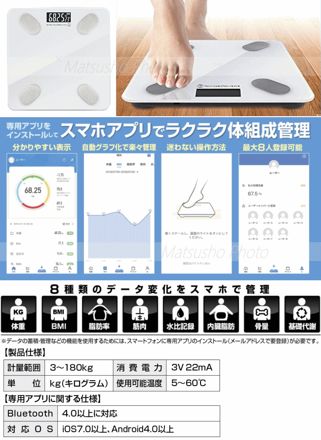8種類のデータ変化をスマホで管理!※データの蓄積・管理等の機能を使用するためにはスマートフォンに専用アプリのインストール(メールアドレスで要登録)が必要です。